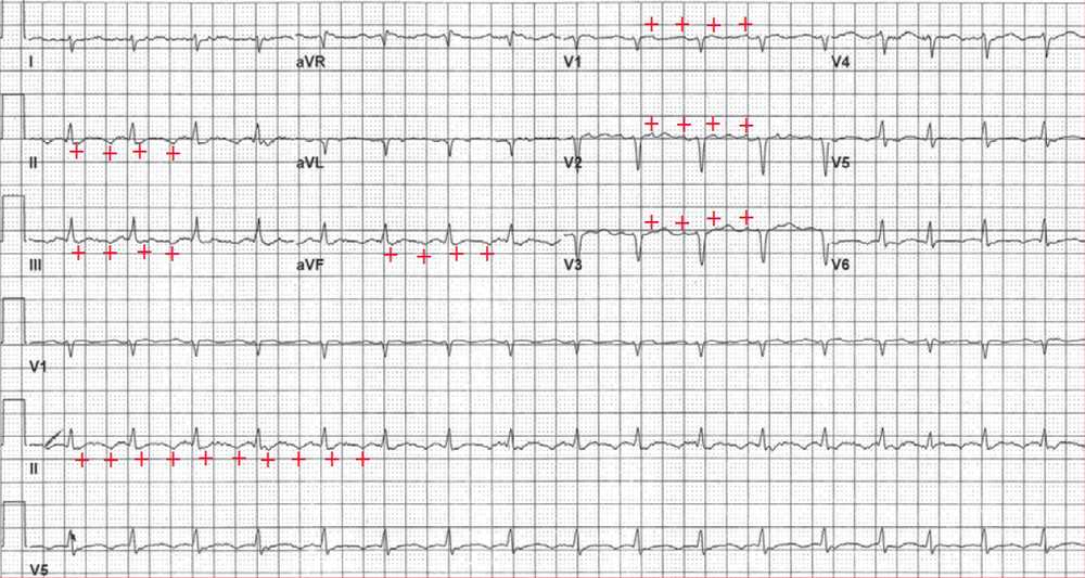 The next ECG (see below) made shortly after the first shows evidence of atrial activity in leads I I, I I I, aVF, and V1–V3 (+). The atrial waveforms are undulating without any isoelectric baseline between them. The atrial rate is 260 bpm and hence this is atrial flutter with 2:1 AV conduction.