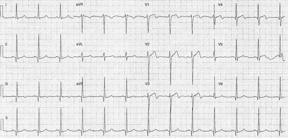 - Up-sloping ST Elevation in lead V1-4 (1mm)