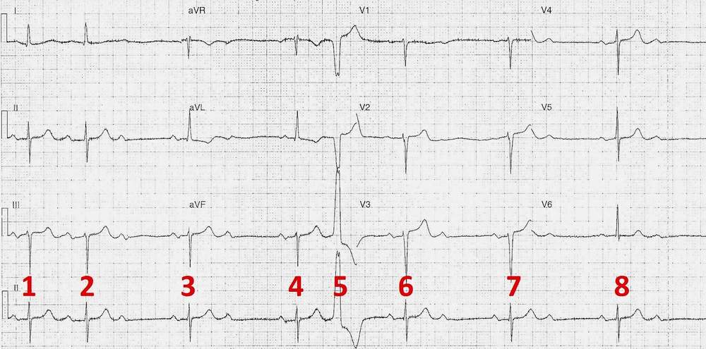 - Non-conducted atrial complexes between complexes # 2 & 3, 3 & 4, 6 & 7