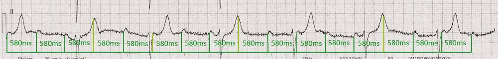 An urgent venous blood gas show no hypo- or hyperkalemia and the rest of her electrolytes, renal function and serial troponins were normal. She was admitted to CCU on an isoprenaline (isoproterenol) infusion and had a pacemaker inserted without complication.