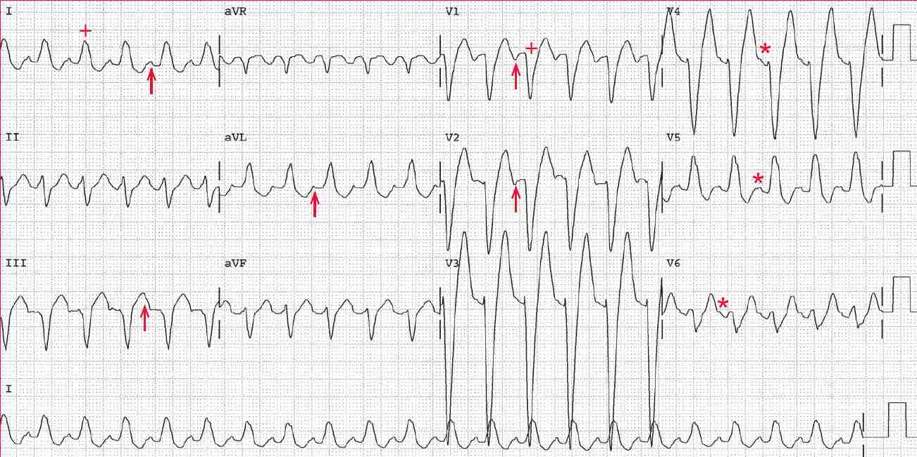 The QRS complex duration is prolonged (0.16 sec), and there is a pattern characteristic of left bundle branch block (LBBB; broad R wave in leads I and V5 and a QS complex in lead V1 [+]).