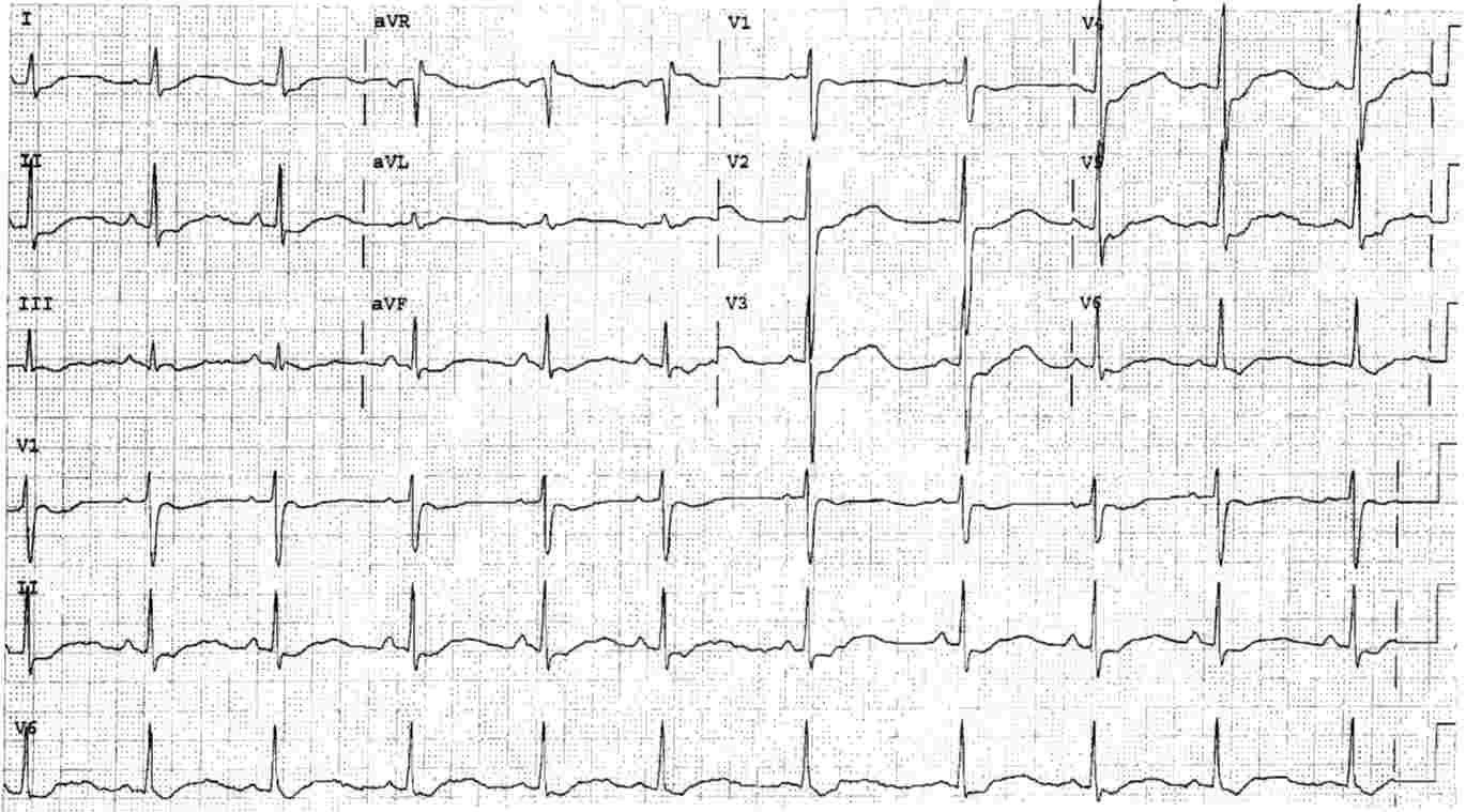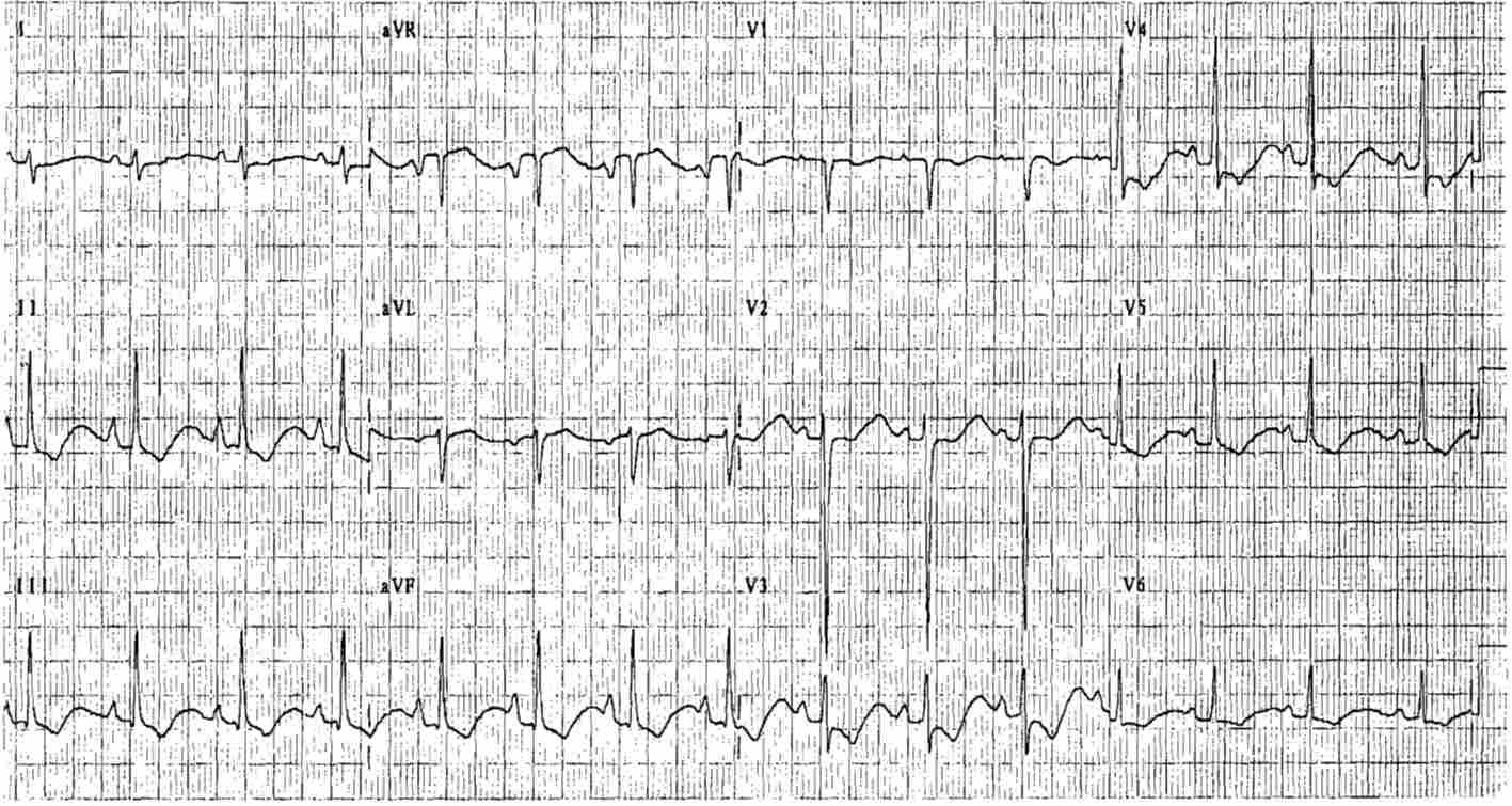 - Long QT interval, more precisely long QU interval, with evident U waves best seen in Leads V2 to V5.