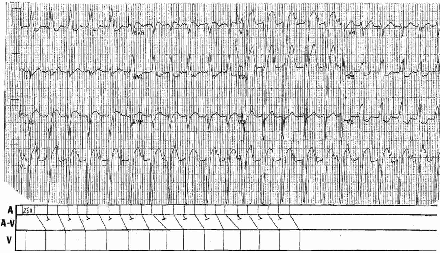 At a first glance the Wide QRS Tachycardia is grossly irregular and cannot be ventricular tachycardia. The P-P cycle is difficult to measure, but appears to be regular at a rate of 250/min.