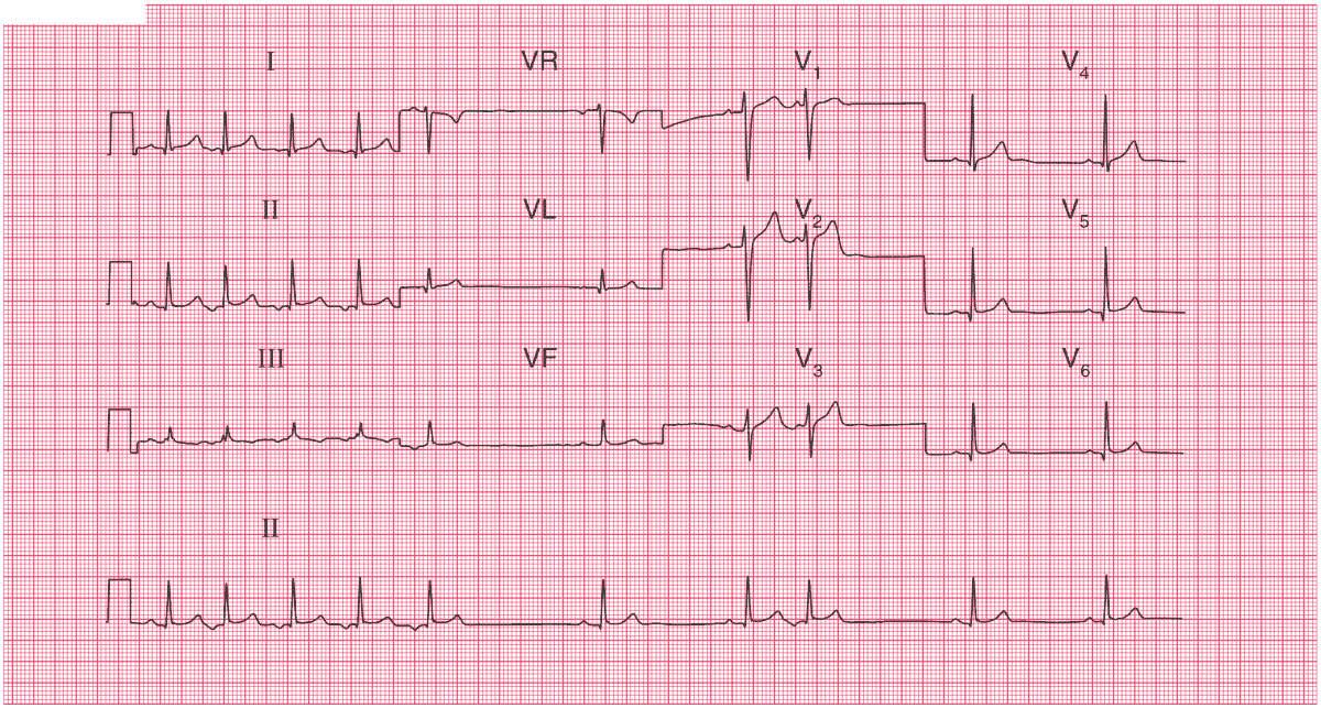 - The next four beats, at about 100/min, have abnormal (inverted) P waves, and this is an atrial tachycardia