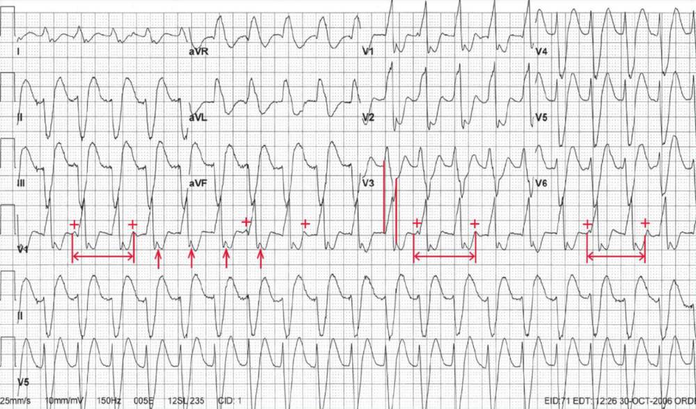 It should be noted that the positive waveform that appears to be present after the QRS complex in leads V1-V2 (↑) is not a P wave but is actually part of the QRS complex. This can be established by measuring the maximum QRS complex width (eg, in lead V3) and comparing this with the QRS complex width in leads V1-V2 (||).