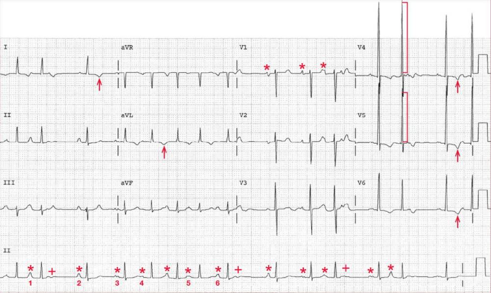 The rhythm is irregularly irregular at an average rate of 90 bpm. There is a P wave (*) before each QRS complex; some P waves after the QRS complexes are nonconducted (+).