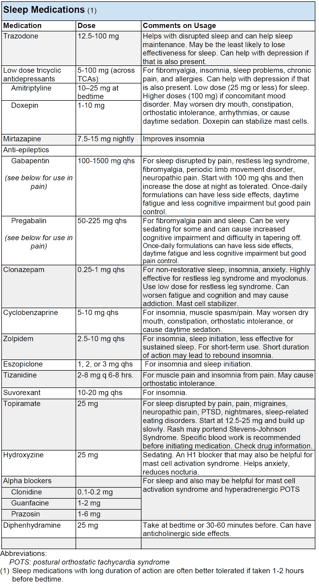 - Low dose tricyclic antidepressants (TCA) 5-100 mg (across TCAs) – For fibromyalgia, insomnia, sleep problems, chronic pain, and allergies. Can help with depression if that is also present. Low dose (25 mg or less) for sleep. Higher doses (100 mg) if concomitant mood disorder. May worsen dry mouth, constipation, orthostatic intolerance, arrhythmias, or cause daytime sedation. Doxepin can stabilize mast cells.