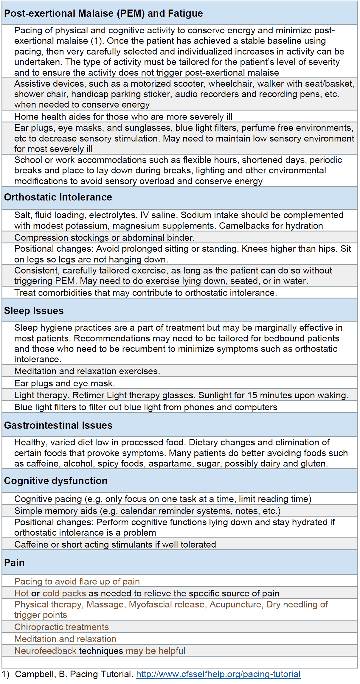 Pacing of physical and cognitive activity to conserve energy and minimize post-exertional malaise (1). Once the patient has achieved a stable baseline using pacing, then very carefully selected and individualized increases in activity can be undertaken. The type of activity must be tailored for the patient’s level of severity and to ensure the activity does not trigger post-exertional malaise.