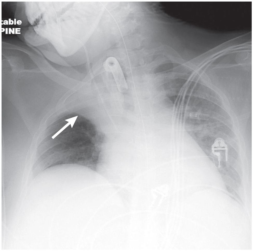 25-year-old woman, status post conversion of pre-existing endotracheal tube to a tracheostomy device, with an abrupt decrease in oxygen saturations and increased work of breathing immediately following the procedure.