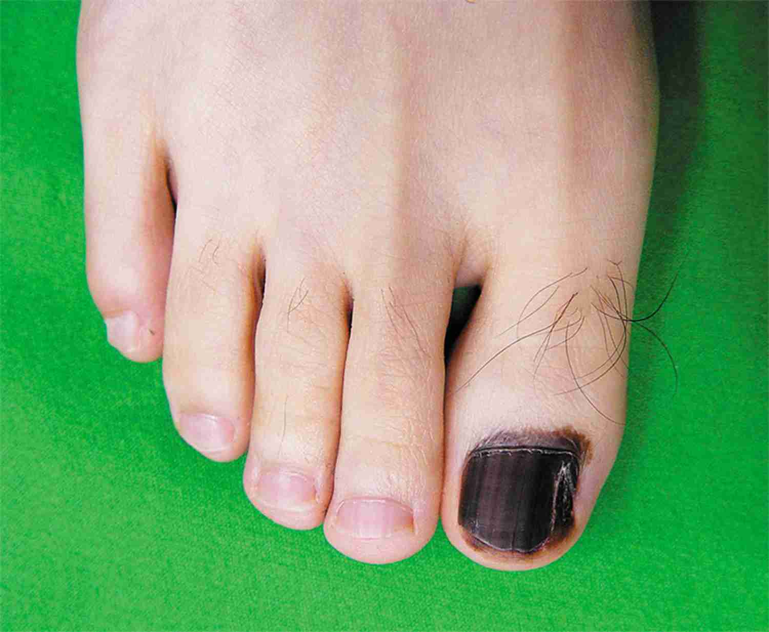 A 37-year-old man presented with a brownish-black nail on the great toe of the right foot. A darkly pigmented linear patch had started to form within the toenail 4 years earlier and had widened and darkened over time.
