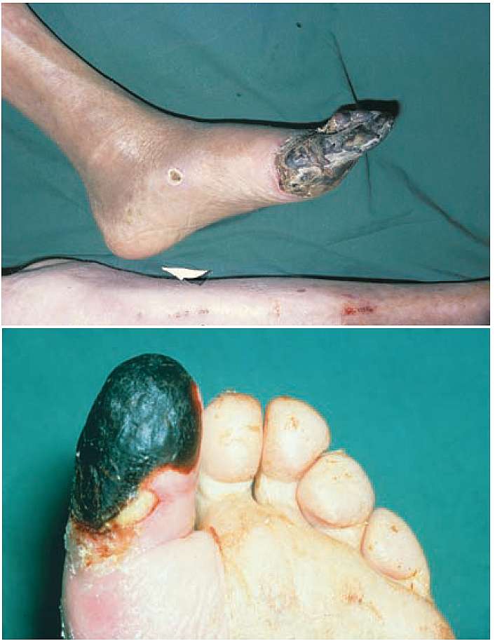 A 40-year-old man presented to the accident and emergency department with these black, but not especially painful, toes on his left foot. He was a known diabetic, on insulin but confessed to being very bad about taking it and was rather confused about his correct dosage.