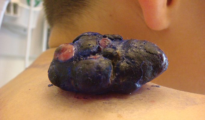 On physical examination, the patient was noted to have a 4-cm exophytic nodule covered by dried heme crust. A shave biopsy was performed.
