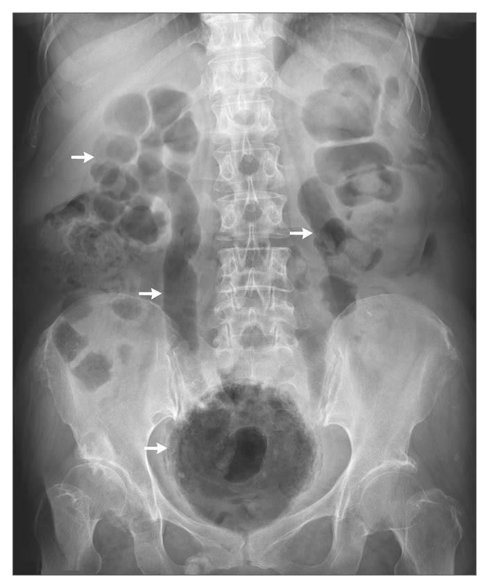 Plain abdominal radiography showed air throughout the urinary tract in the kidneys, ureters, and bladder (arrows).