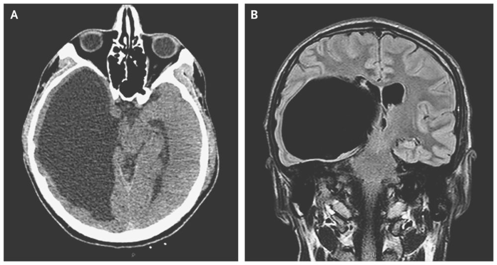 Magnetic resonance imaging (Panel B) confirmed the presence of a large cystic lesion extending from the temporal and posterior horns of the right lateral ventricle (axial size, 11 cm by 7 cm), with a mild midline shift of the third ventricle, and compression of the midbrain and brain stem with thinning of the temporal and occipital cortexes. A large, asymptomatic, intraventricular arachnoid cyst was diagnosed.