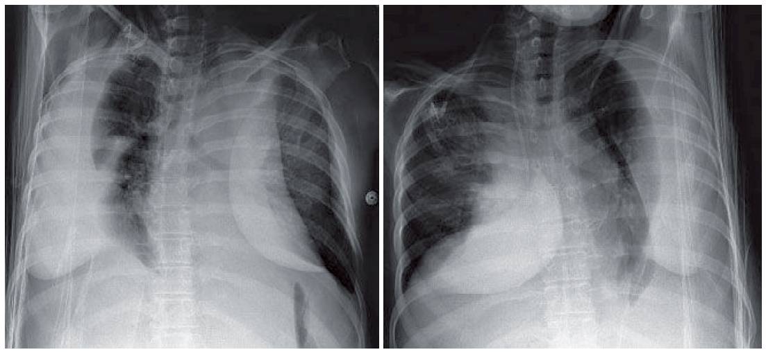 - Frontal radiograph (Fig. 1) shows increased distance between the stomach bubble and the left aerated lower lung. The right diaphragmatic peak is displaced lateral to the midclavicular line.