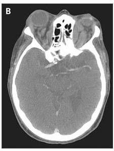 Computed tomography of the head showed orbital masses that followed the contour of the orbit and did not cause bony erosion (image below).