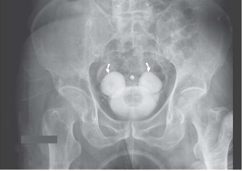 After treatment with antibiotics, the patient’s fever and pyuria subsided. He declined any further evaluation or intervention. During the year after diagnosis, two more urinary tract infections developed.