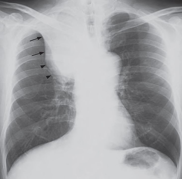 The ‘Golden S sign’ – collapse of the right upper lobe with a well demarcated lateral border formed by the elevated horizontal fissure (arrows), and a focal convex bulge at the apex due to the centrally located bronchogenic carcinoma (arrowheads).
