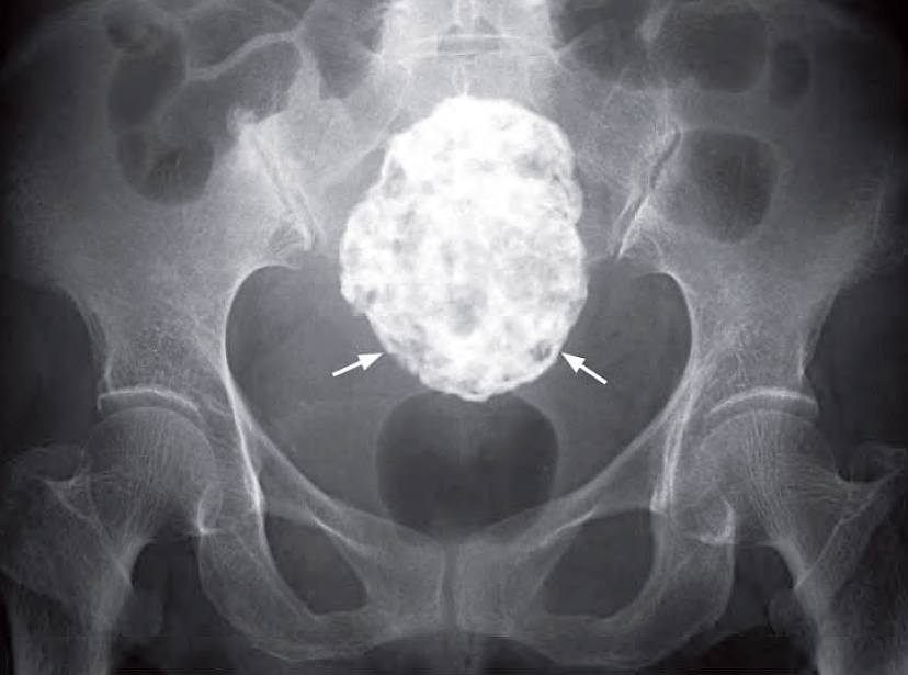 - Plain radiograph may show characteristic amorphous calcification in a degenerated fibroid.