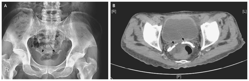 Although no hydronephrosis or radiopaque kidney stones were present, bilateral tubular calcification of the vasa deferentia was incidentally noted on a plain radiograph (Panel A, arrows) and on an axial section of a computed tomographic image of the pelvis, performed without the administration of contrast material (Panel B, arrows).