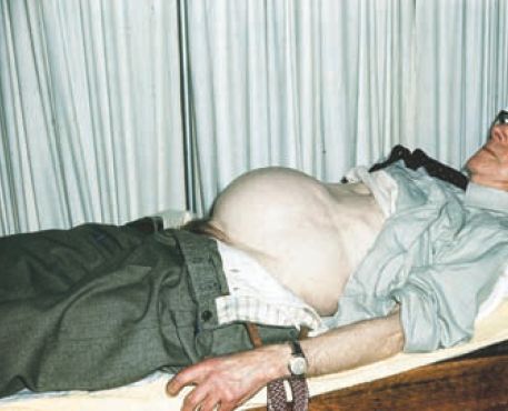 The patient has chronic retention of urine, due to a clinically benign prostatic hyperplasia . Acute retention is extremely painful, but, in the chronic case, the bladder becomes progressively and gradually distended. The intense frequency in these patients is actually dribbling of urine from the full bladder, the so-called ‘retention with overflow’ or ‘overflow incontinence’.