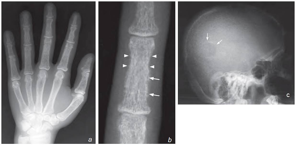 b) Magnifi ed view of the third middle phalanx shows a lace-like cortex due to bone resorption and enlargement of the Haversian canals (latter seen as the numerous holes in the cortex, [arrows]). There is also subperiosteal bone resorption (arrowheads).