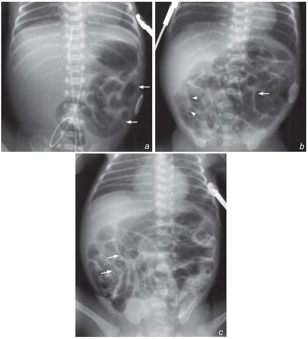 b) As the disease progresses, dilated bowel loops (arrow) are seen all over the abdomen and ‘sandy foamy’ appearance (arrowheads) due to presence of faeces and intramural gas is noted over the right lower quadrant of the abdomen.