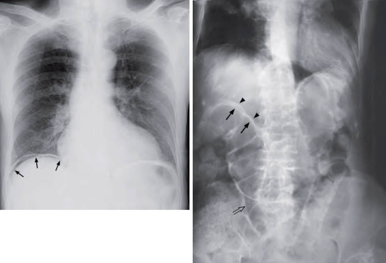 A CT scan is better at demonstrating the extent of intraperitoneal free gas and detecting small amounts of gas. Note that hepatic interposition of the bowel may mimic free gas under the diaphragm. This is called Chilaiditi’s sign and is seen in asymptomatic patients. When it is associated with symptoms, either intermittent or persistent, it is known as Chilaiditi’s syndrome.