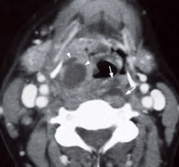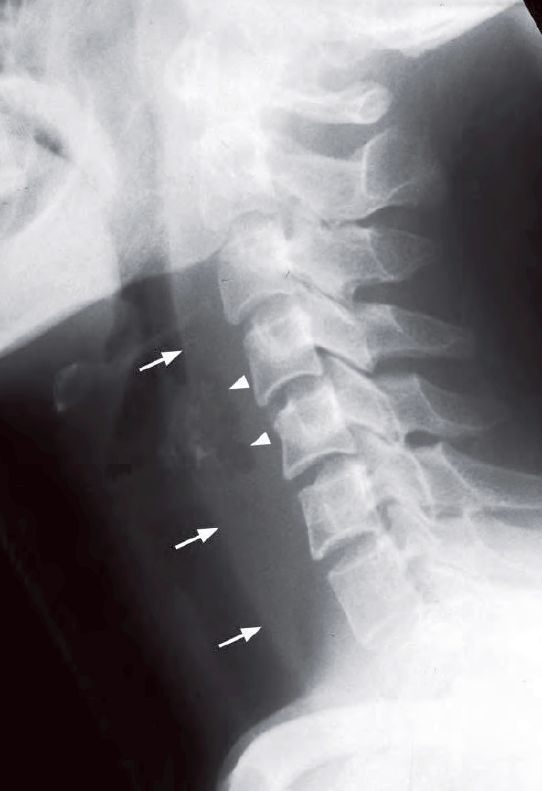Lateral radiograph of the neck shows thickening of the retropharyngeal soft tissues (arrows) and localized gas lucency within (arrowheads) suggestive of a retropharyngeal abscess.