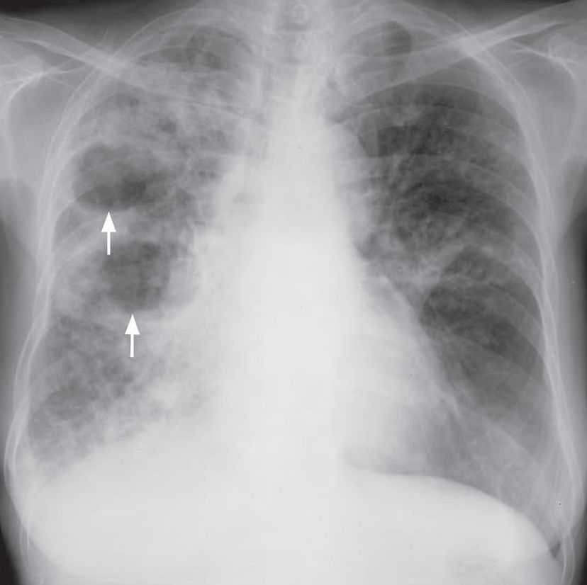 - Multiple areas of air-space opacification in the right lung also involving the apex