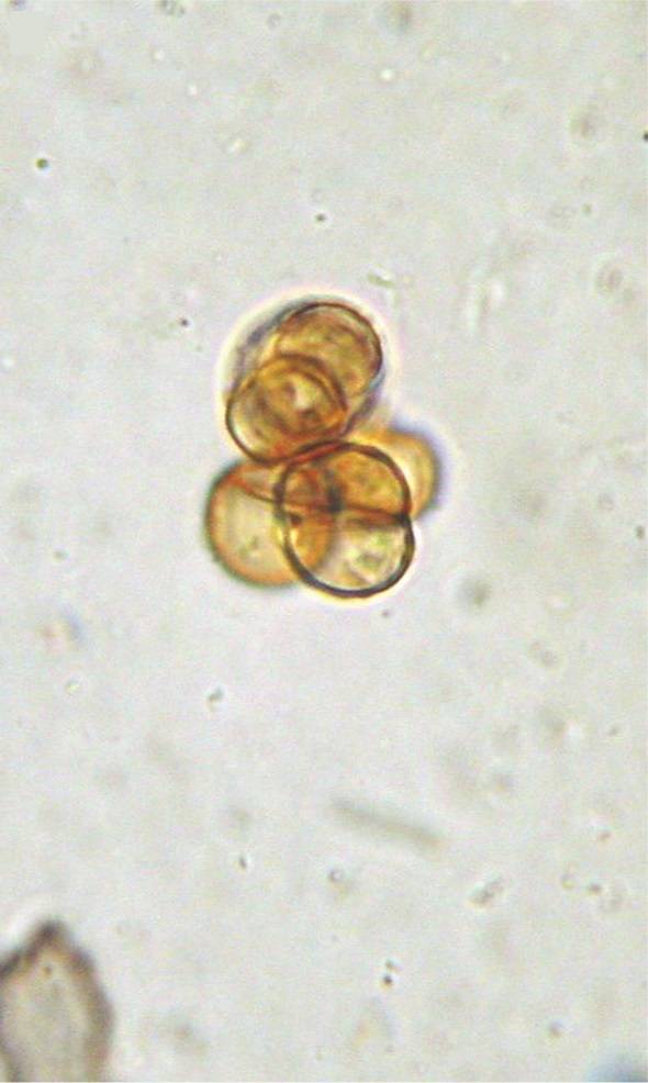 Examination of a skin scraping prepared with 10% potassium hydroxide revealed pigmented, thick-walled, multicellular structures known as Medlar bodies (see image), a finding that suggested chromoblastomycosis, a chronic, subcutaneous mycosis that can develop at sites of skin trauma.