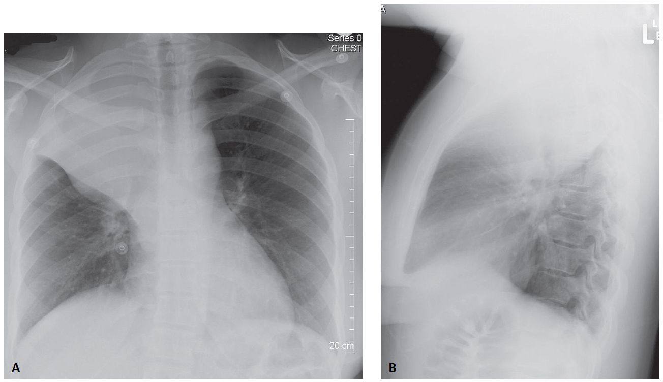 PA and lateral chest X-rays reveal reduction in volume of the right hemithorax, right hemidiaphragm elevation, and a “peaked” appearance (i.e., juxtaphrenic peak) of the superomedial hemidiaphragm. The trachea is minimally displaced to the right.