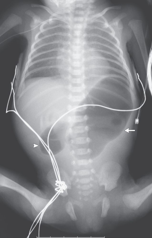 A girl weighing 1080 g was born at a gestational age of 29 weeks because of spontaneous premature rupture of membranes. Enteral feeding through a nasogastric tube was started 8 hours after birth but was not tolerated.