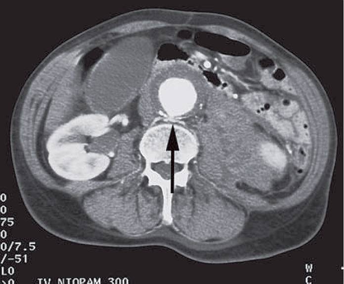 The CT scan shows a 6 cm abdominal aortic aneurysm with a rind of thrombus (called mural thrombus) around the lumen, which is white due to the administration of contrast medium. The rind is deficient posteriorly, the site of a rupture (arrowed).