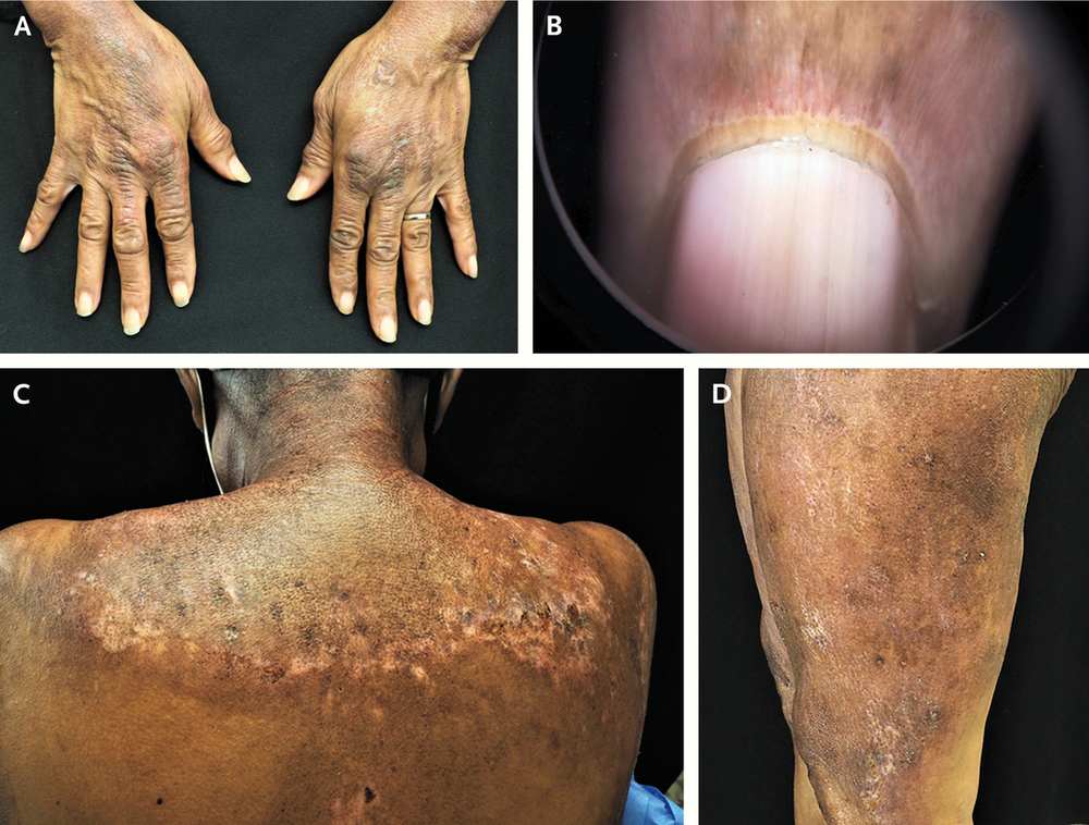 The results of physical examination were noteworthy for the presence of hyperpigmented, erythematous papules overlying the metacarpophalangeal and interphalangeal joints of both hands, findings consistent with Gottron’s papules (Panel A); dilated capillaries of the proximal nail folds (Panel B); dyschromic patches, plaques, and poikiloderma on the posterior shoulders, findings consistent with the shawl sign (Panel C); and poikilodermatous, dyschromic changes of the lateral thighs, a finding consistent with the Holster sign (Panel D).
