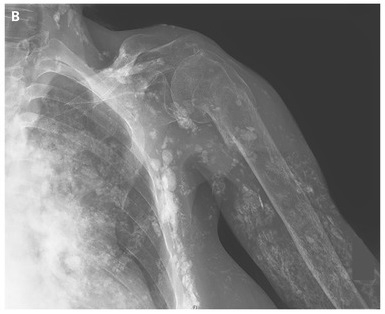 A radiograph of the left shoulder showed extensive soft-tissue calcification and an old fracture of the surgical neck of the humerus, which was attributed to glucocorticoid-induced osteoporosis.