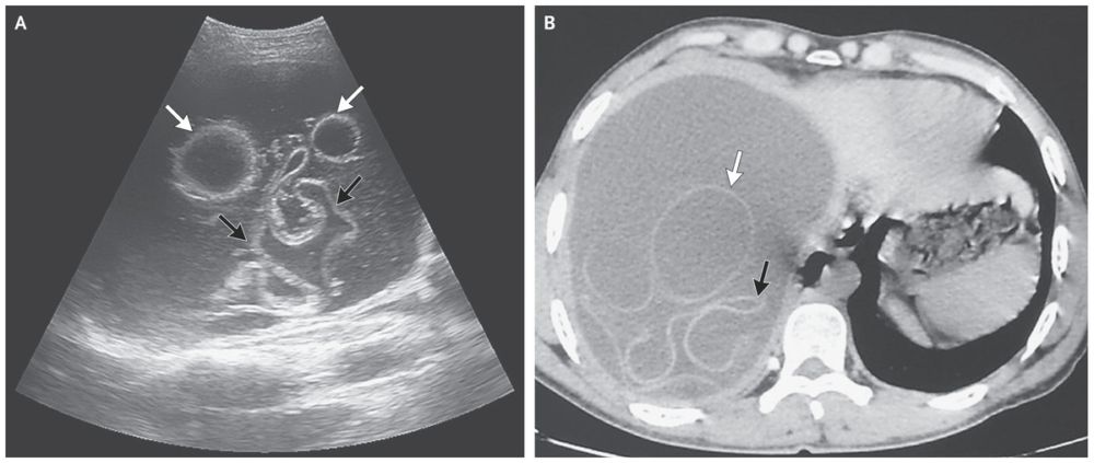 Ultrasonography (Panel A) and computed tomography (Panel B) of the abdomen revealed a large cyst in the right lobe of the liver, containing hydatid membranes (black arrows) and daughter vesicles (white arrows).