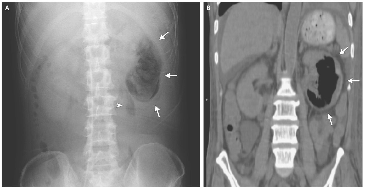 Abdominal radiography (Panel A) and computed tomography (Panel B) revealed gas collection in the parenchyma (arrows) and perinephric space (arrowhead) of the left kidney.