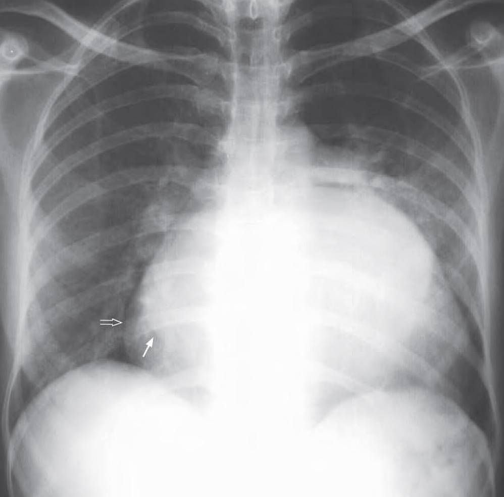 - Enlarged left atrium seen as a double density (arrow) through the right upper cardiac border (open arrow)