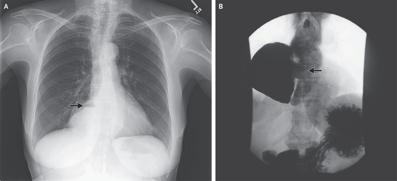 A chest radiograph showed a density containing an air–fluid level to the right of the heart (Panel A, arrow). Radiography of the esophagus revealed an epiphrenic diverticulum, 10 by 15 cm (Panel B, arrow), and delayed emptying at the gastroesophageal junction with esophageal dilatation and tortuosity, which are findings consistent with the patient’s diagnosis of achalasia.