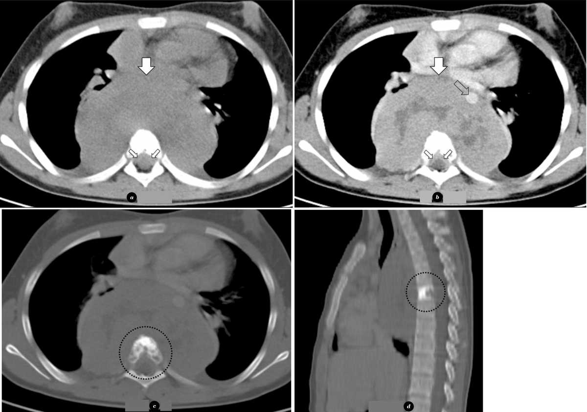 Chest CT revealed a midline well-defined soft-tissue mass with a diameter of 12 cm, located in the posterior mediastinum, adjacent to the vertebral bodies from T3 to T8, encasing the descending aorta (image below). The mass was associated with permeative destruction and osteosclerosis of the 6th thoracic vertebral body (image (d)). There was also extension to the spinal canal through the neural foramina at the 6th to 7th thoracic vertebrae.