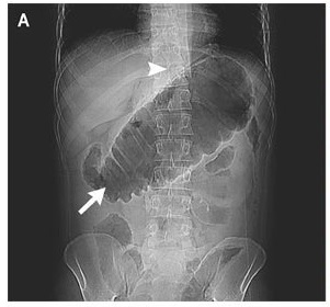 X-Ray of the abdomen showed a severely dilated transverse colon (arrow) and free air (arrowhead).