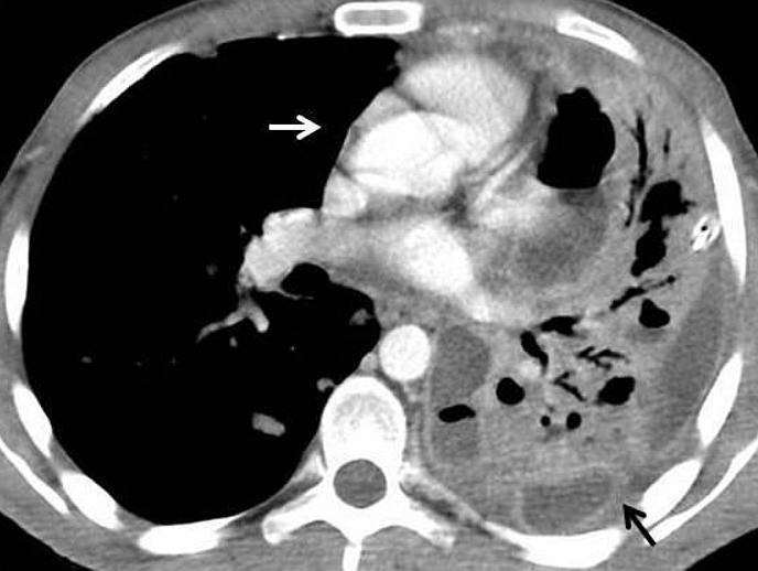 Posteroanterior radiography showed a hydropneumothorax on the left side with a collapsed left lung. On the contralateral side, ill-defined nodules and consolidations in the right upper lobe and upper segment of the lower lobe were seen (Fig. 1).