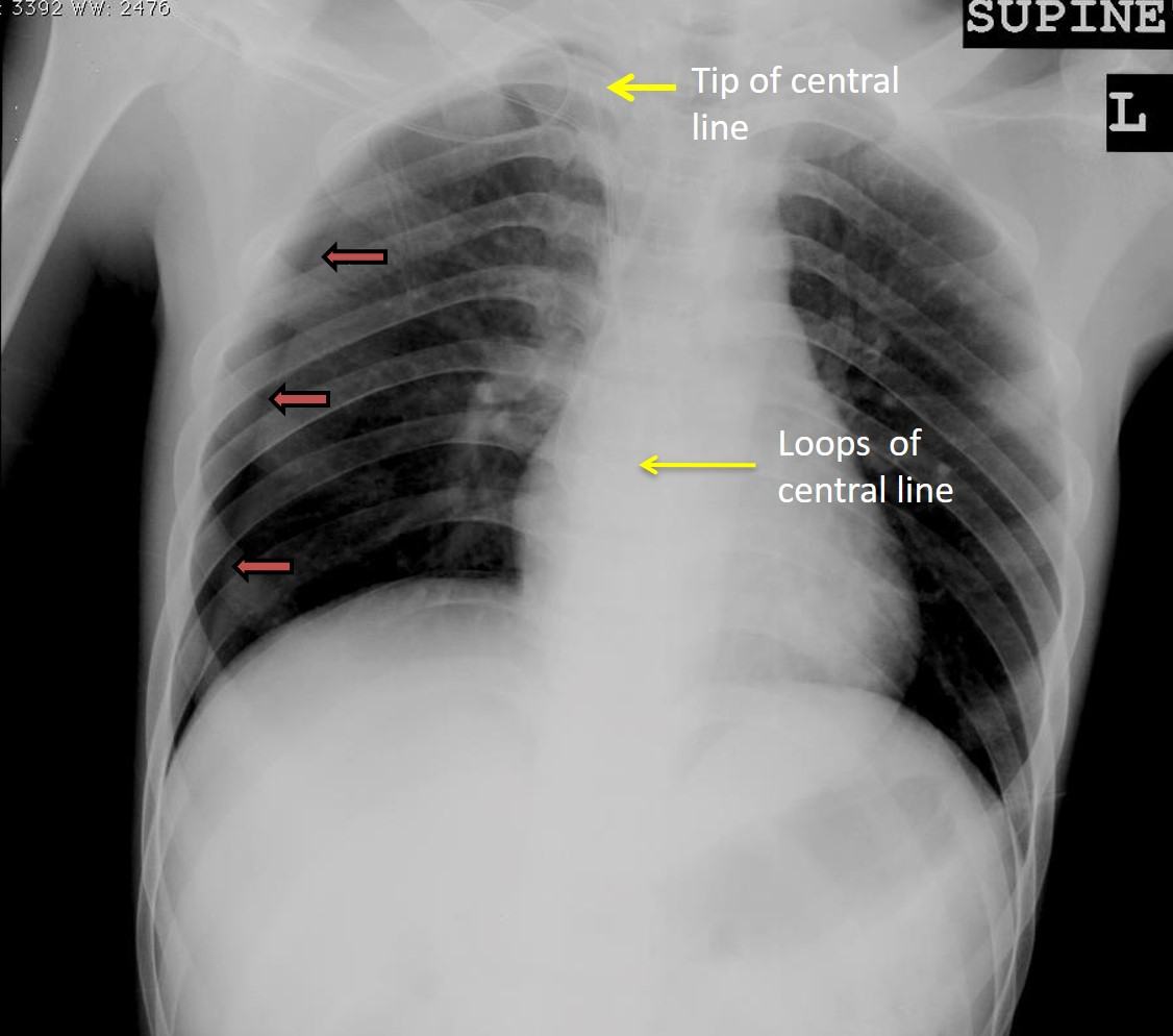 - The central line is seen forming a loop at atrial region and its tip seen over the upper mediastinal area (yellow arrows)