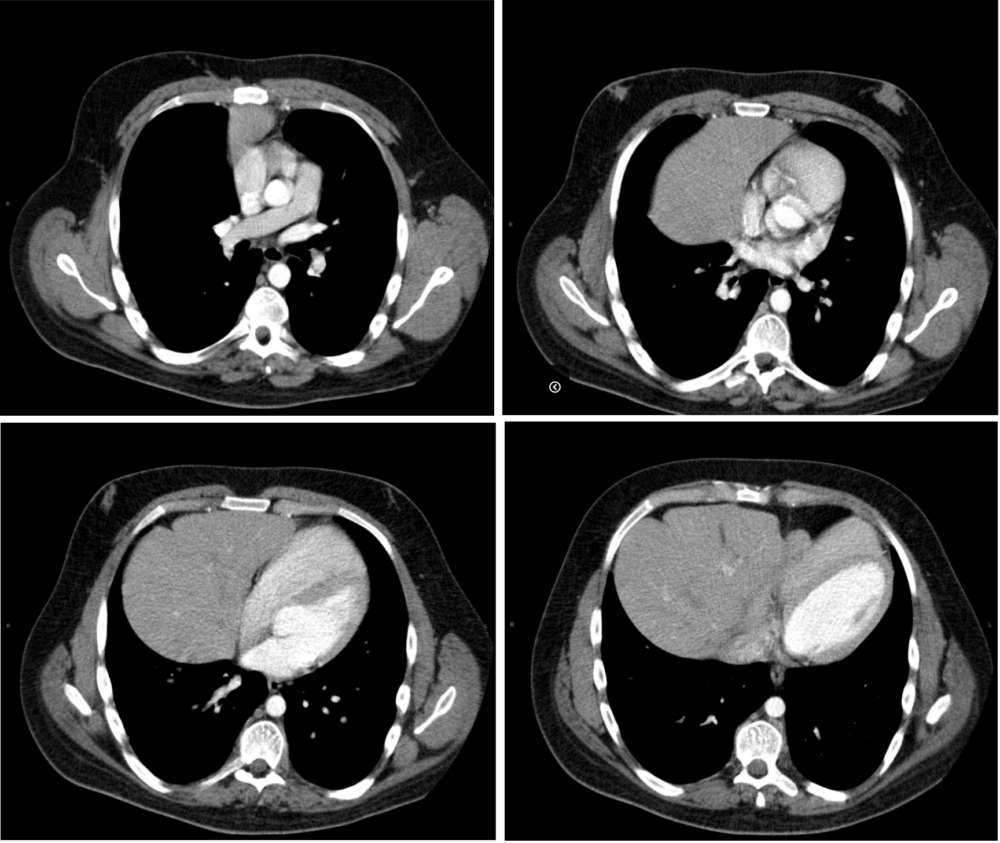 Because of his new symptoms a chest radiograph was done which unexpectedly revealed a large right paracardiac soft tissue density mass. A CT thorax was thus performed to investigate this further.