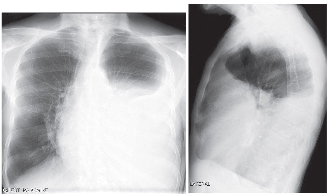 PA and lateral chest X-rays show opacification of nearly two-thirds of the left hemithorax. Note the airless left mid- and lower thorax and contralateral mediastinal shift from this pleural space-occupying process.