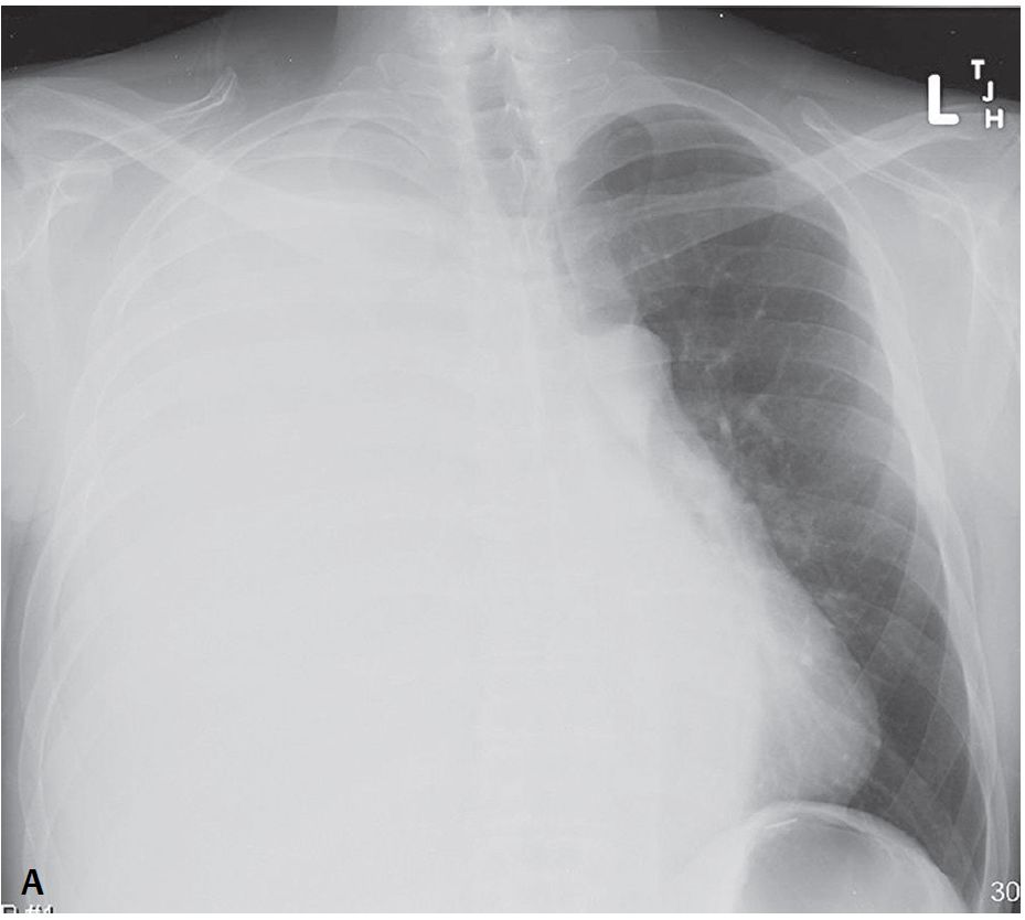 PA chest radiograph show complete “white-out” of the right hemithorax. No air bronchograms are seen and only the left diaphragm is perceptible on the lateral exam. Note the contralateral displacement of the tracheal air column and mediastinum “away” from the white-out on the PA exam.