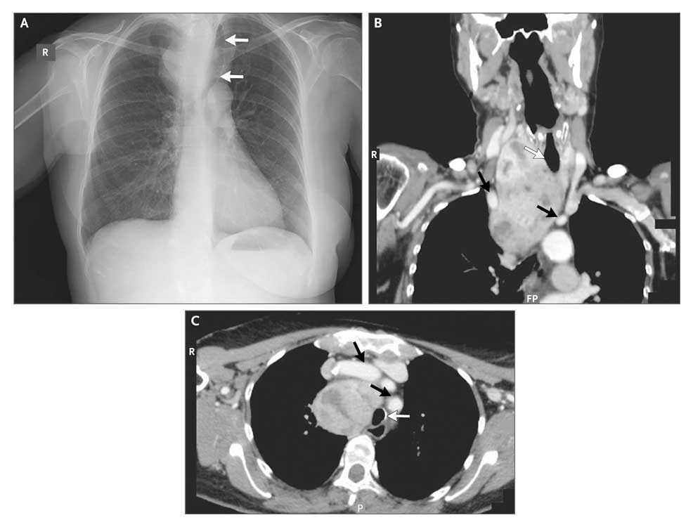 Chest radiography (Panel A) showed tracheal deviation (arrows). Cervical and mediastinal computed tomography (Panels B and C, respectively) showed a large goiter (8 by 6 by 10 cm) extending from the laryngeal cartilage into the mediastinum, displacing vascular structures (black arrows) and causing both compression and deviation of the trachea (white arrows).