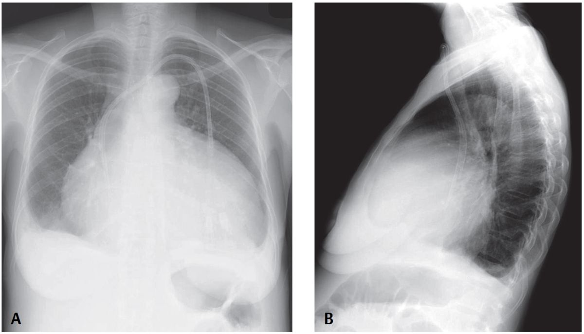Lateral exam also shows globular enlargement of the cardiomediastinal silhouette and separation of the outer retrosternal and inner epicardial fat lines—fat pad or Oreo cookie sign).