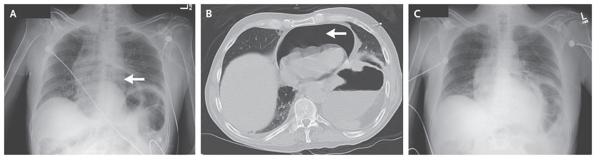 Chest radiography showed air in the pericardium (Panel A, arrow). Computed tomography of the chest confirmed the presence of a large pneumopericardium (Panel B, arrow) but no pneumothorax or pneumoperitoneum.